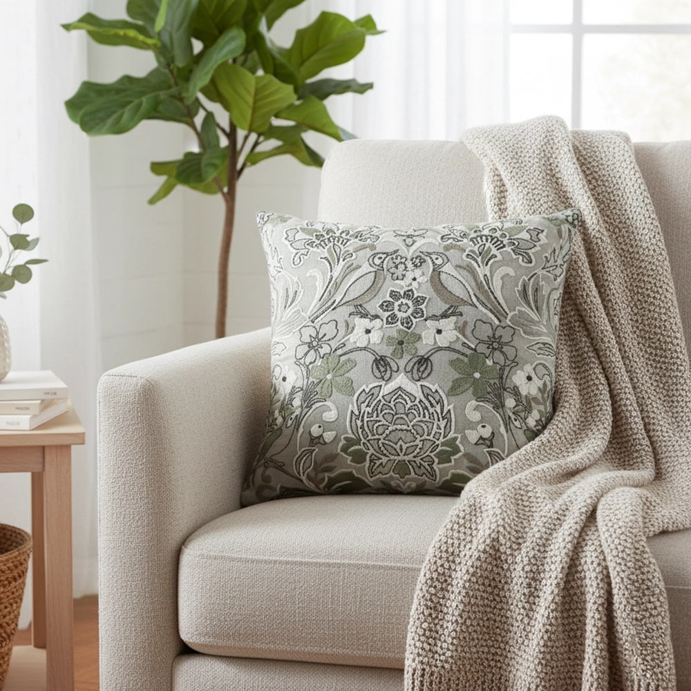Add a refined touch of nature to your decor with the Harmony Cushion, featuring an intricate tapestry of birds and floral motifs in soft green and grey tones. Its detailed embroidery and harmonious design bring elegance and tranquility to any setting making it a timeless accent for your living space.