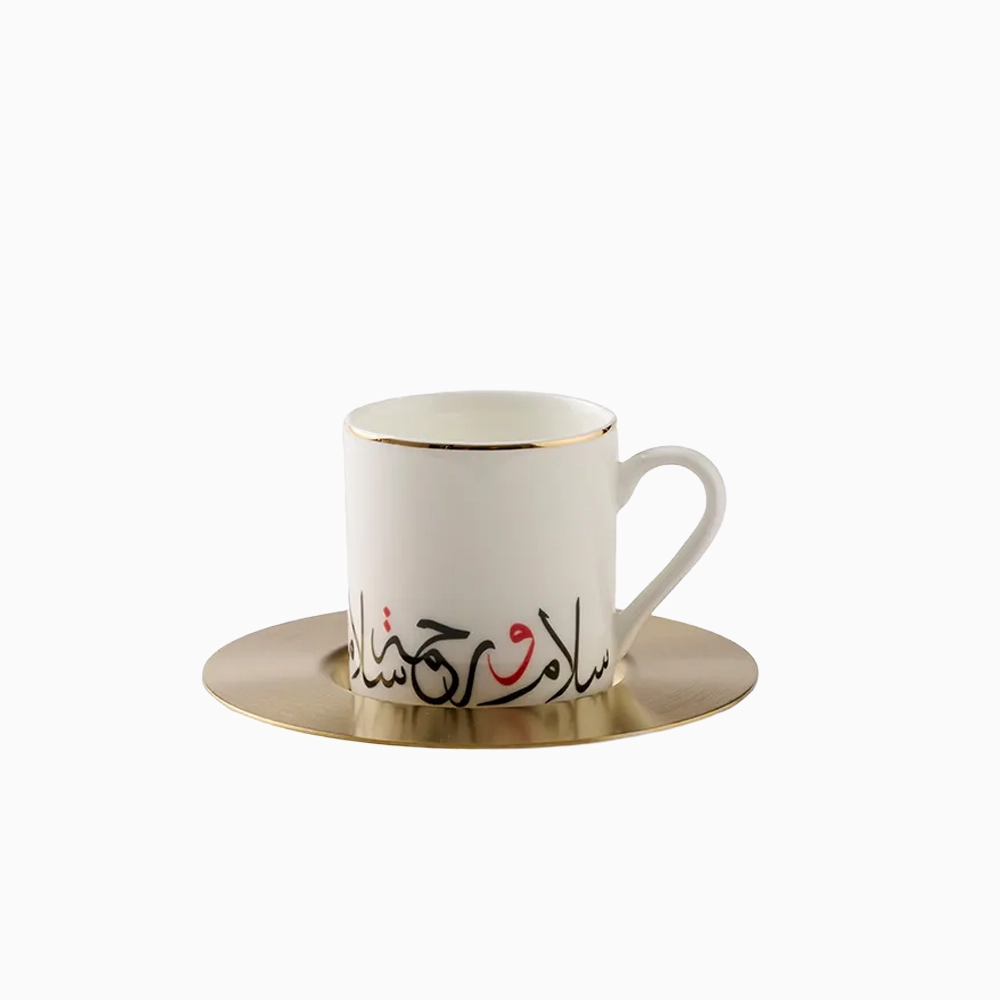 Enhance your collection with the Salam Wa Rahma Espresso Set. Crafted from fine porcelain and brass saucers, this elegant set features bold black typography, red accents, and a gold spelling “Salam Wa Rahma” in Arabic. Embodying peace and compassion, it brings warmth and sophistication to Ramadan gatherings and cherished moments with loved ones.