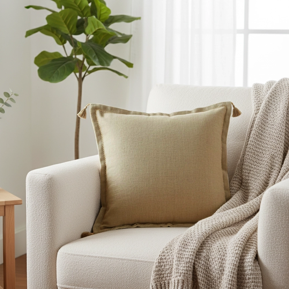 Add a subtle touch of sophistication to your space with the Calm Cushion, featuring a soft textured fabric in warm beige with tassel details at each corner. Its minimal design and refined finish make it a versatile accent, perfect for layering on neutral sofas or adding gentle warmth to modern interiors.